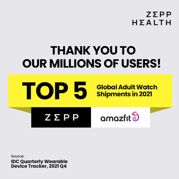 根據IDC的報告,Zepp Health再次在2021年全球智慧手錶出貨量排名前5。 我們致力於利用創新技術的力量讓人們過上最健康的生活。