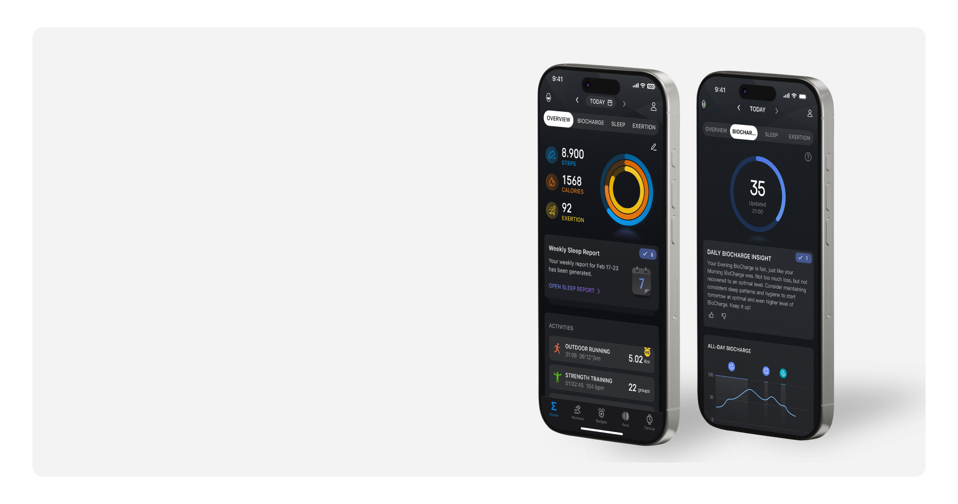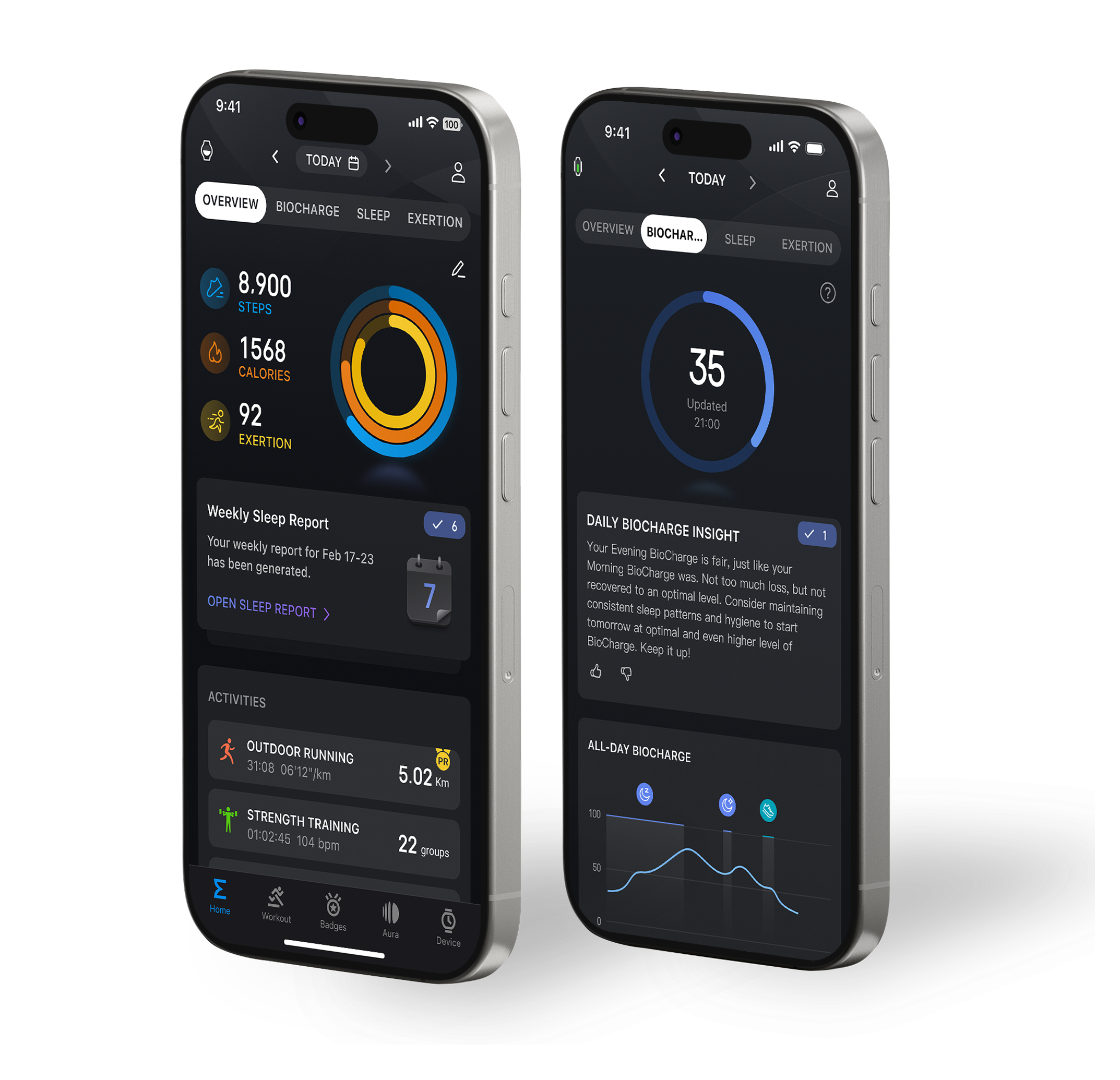 從早晨醒來的那一刻起,你的 BioCharge™ 分數會根據每日訓練、活動量與壓力水平動態調整。