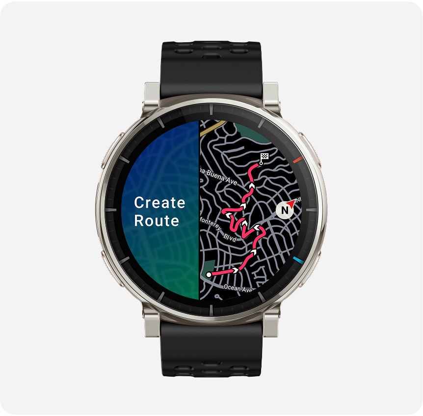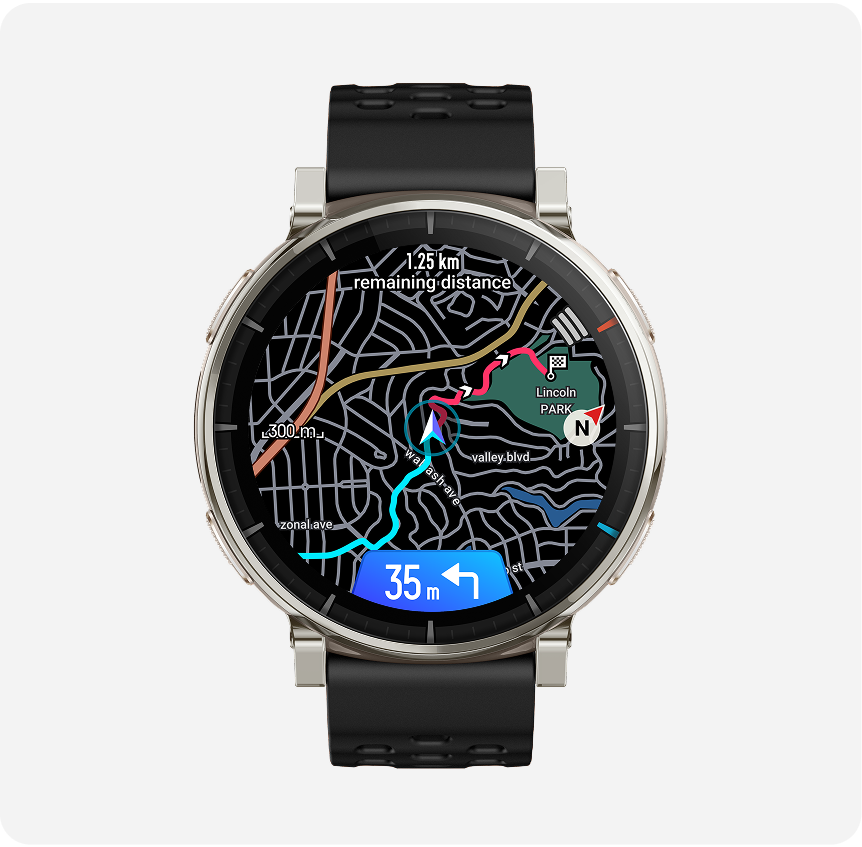 支援轉向導航與離線地圖¹,讓你規劃路線、無需攜帶手機也能安心跑步,並配備高速五大衛星定位系統² 提供精準定位。