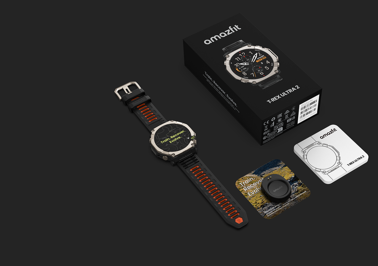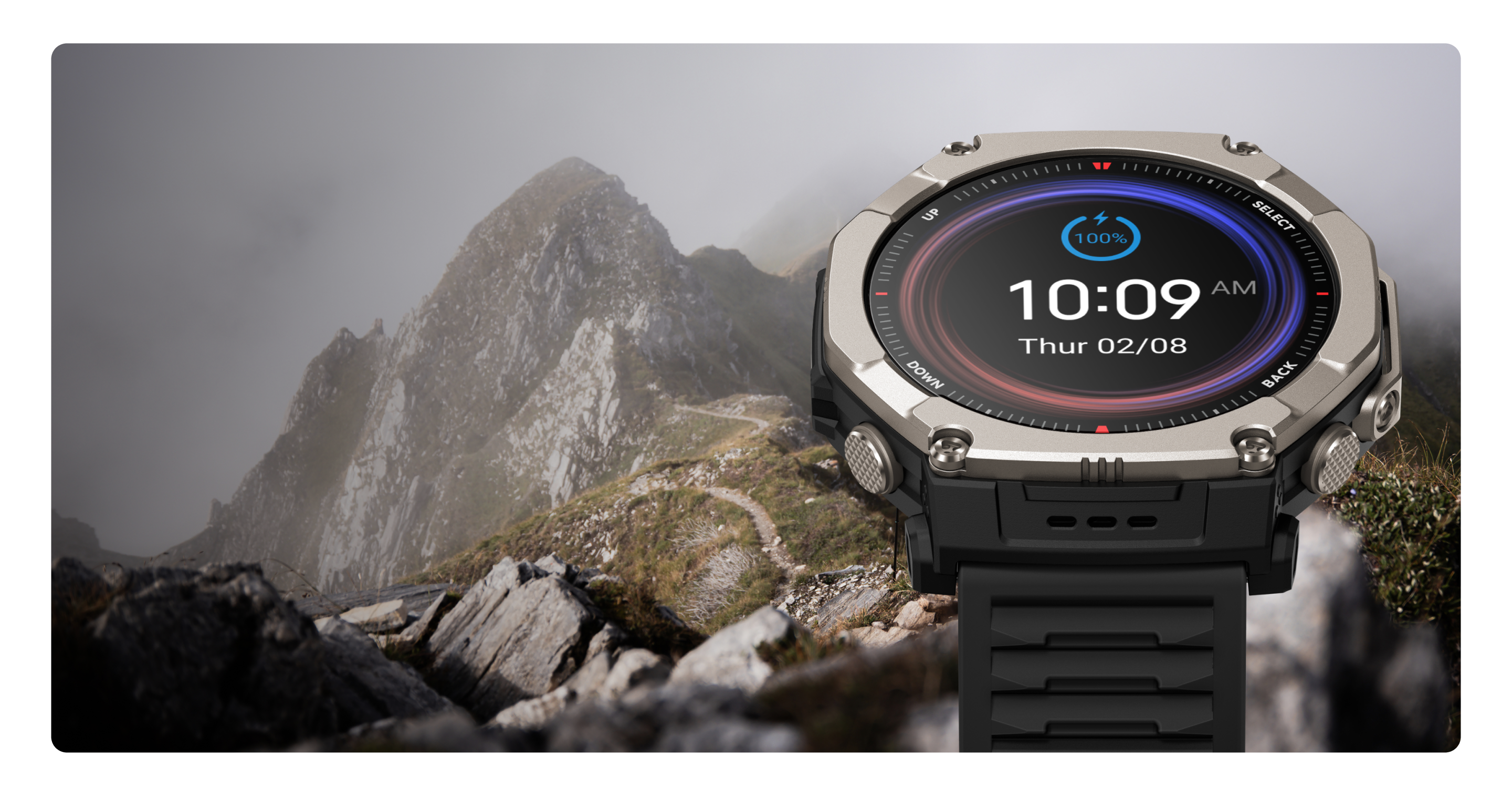 8. 根據 ISO 22810:2010 標準,Amazfit T-Rex Ultra 2 達 10 ATM 防水等級(100 米)。適用於日常潑水、下雪、淋浴、游泳及部分高速水上運動。通過 SGS 第三方測試(報告號 SHES250901797771)。避免於高溫蒸氣環境佩戴。游泳時請使用矽膠或氟橡膠錶帶。若接觸沐浴用品,請以清水沖洗並浸泡 30 分鐘。詳情請參閱 support.amazfit.com。