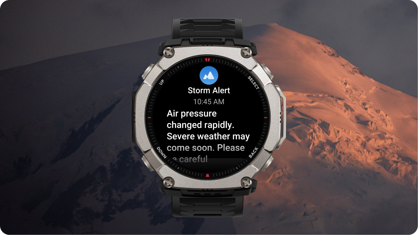 利用氣壓式高度計與暴風警報功能,監測突發天氣變化,於環境轉變時及早獲得預警。高海拔提示功能⁶會在陡峭攀升期間提醒你檢視血氧水平,幫助你隨時掌握身體狀況。